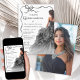A modern Quinceañera invitation that exudes elegance and charm, this chic design has a beautiful illustration of a black ball gown as the focal point. The gown, made of delicate layers of tulle and satin, flows gracefully, shimmering in glamourous hues of onyx black and charcoal grey. The invitation text is bordered by a delicate scalloped monochromatic black ribbon frame, which adds a touch of sophistication. The frame is intricately tied in a bow at the top, with flowing tails that cascade down, enhancing the overall elegance of the design. The back of the invitation has a photo template for including a photo of the birthday celebrant as she prepares to celebrate this important milestone of moving into adulthood. The overall aesthetic is one of beauty and luxury, creating a sense of anticipation for the grand celebration to come. This invitation can be ordered as printed invitations or can be downloaded as a digital invitation.