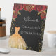 A welcome sign for a Quinceañera, 15th birthday party. A black background with faux gold glitter dust, a golden dress and red roses, florals. Personalise and add a name.