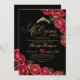 Modern stylish Quinceanera black red and gold 15th birthday invitation with beautiful rose and gold dust on with a gold ink pour effect (the gold is a digital effect, not real foil!) and modern calligraphy. Classy Quinceanera and elegant script and chic flowers print birthday invitation.