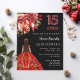 A modern, stylish and glamourous invitation for a Quinceañera, 15th birthday party. A black background, a girl wearing a red and gold dress, red bow, red and pink and golden roses, florals. The name is written with a modern hand lettered style script. Personalise and add your party details.