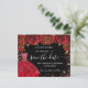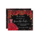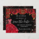 A girly and trendy Save the Date card for a Quinceañera, 15th birthday party. A black background decorated red roses, red faux glitter sparkles and a red dress. Personalise and add a date and name/age. The text: Save the Date is written with a large trendy hand lettered style script.