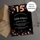 A classic black background, decorated with rose gold stars. Personalise and add a name and party details. Number 15 is written with a balloon style script.