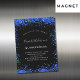 A girly and trendy Quinceañera, 15th birthday party invitation magnet. A chic black background. Decorated with royal blue confetti. Personalise and add a name and party details. The name is written with a hand lettered style script.
