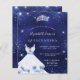 A modern, stylish and glamourous invitation for a Quinceañera, 15th birthday party. A midnight blue background with faux glitter dust, a tiara and a dress. The blue colour is uneven. The name is written with a modern hand lettered style script. Personalise and add your party details.