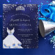 A modern, stylish and glamourous invitation for a Quinceañera, 15th birthday party. A midnight blue background with faux silver glitter dust, a tiara and a dress. The blue colour is uneven. The name is written with a modern hand lettered style script. Personalise and add your party details.