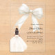 This sophisticated design features a large ivory bow adorned with delicate pearl details, paired with a graceful gown illustration. The transparent acrylic finish creates a modern, refined look that feels both luxurious and unforgettable.