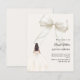 This sophisticated design features a large ivory bow adorned with delicate pearl details, paired with a graceful gown illustration.