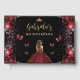 This elegant quinceañera guest book features burgundy red roses on a black background sprinkled with burgundy faux glitter. A gold tiara, a dark-haired girl in a burgundy princess dress and small burgundy butterflies decorate the front cover. The guest of honour's name appears in elegant gold-coloured handwriting script, with the word "quinceañera" in sans serif font below. Add text of your choice to the spine.