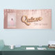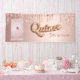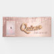 A banner for a girly and glamourous Quinceañera, 15th birthday party. A faux rose gold metallic looking background with rose gold, pink faux glitter drips, paint dripping look. Personalise and add your own photo of the birthday girl and her name. The word: Quince is written with a golden balloon style font, script.