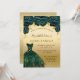 A modern, stylish and glamourous invitation for a Quinceañera, 15th birthday party. A faux gold background with green faux glitter dust, an emerald green dress and green roses, florals. The name is written with a modern hand lettered style script. Personalise and add your party details.
