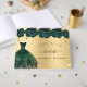 For a Quinceañera, 15th birthday party. A golden background with faux gold glitter, a green dress and green roses, florals. The name is written with a modern hand lettered style script. Personalise and add a name and date.