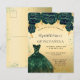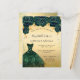 A modern, stylish and glamourous invitation for a Quinceañera, 15th birthday party. A faux gold background with green faux glitter dust, an emerald green dress and green roses, florals. The name is written with a modern hand lettered style script. Personalise and add your party details.
