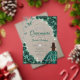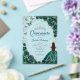 Emerald green silver and white Quinceanera celebration invitation. Features brunette girl in ball gown dress, script font, silver butterflies, watercolor roses and tiara. Perfect for an elegant princess style glam celebration. Personalize with your own details. Stylish transparent or frosted acrylic invitations.