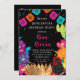 Design features a printed coloured floral element in shades of orange, teal, pink, green, purple and green watercolor flowers on a black background with papel picado banner, cactus, golden crown with red rubies and a girl in red dress. Calligraphy or type writing.