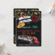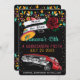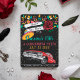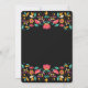 Colourful Quinceañera "Save the Date" with Mexican themed floral decorations and gold confetti on the borders, featuring a beautiful illustration of a red lowrider, a lovely red rose, and a yellow sombrero on a black background.