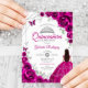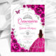 Fuchsia, silver and white Quinceanera celebration invitation. Features, brunette girl in ball gown dress, script font, butterflies, watercolor roses and tiara. Perfect for an elegant princess style glam celebration. Personalise with your own details. Printed Zazzle invitations or instant download digital printable template.