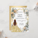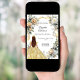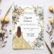 A white background. Decorated with white and yellow florals, sage green greenery and a golden ribbon. A girl wearing a tiara and a dress. Personalise and add a name and details.