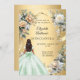 A faux gold looking background. Decorated with white and yellow florals, sage green greenery, a golden ribbon. A girl wearing a tiara and a green dress. Personalise and add a name and details.