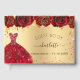 For a Quinceañera, 15th birthday party. A golden background with red and faux gold glitter sparkles, a dress and red roses, florals. The name is written with a modern hand lettered style script. Personalize and add a name and date.