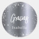 A faux silver metallic looking background. Decorated with faux glitter dust. Personalise and add your name. With the text: Gracias