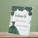 A welcome sign for a Quinceañera, 15th birthday party. A white background decorated with green dress, flowers, roses and confetti. Personalise and add a name and date.