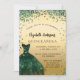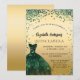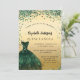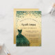 A modern, stylish and glamourous invitation for a Quinceañera, 15th birthday party. On the front: A faux gold looking background with green confetti, an emerald green dress. The name is written with a modern hand lettered style script. Personalise and add your party details.