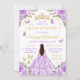 Celebrate her milestone in style with this elegant Quinceañera invitation featuring a girl in a sparkling purple ball gown, viewed gracefully from the back. Surrounded by soft florals, fluttering butterflies, and a regal golden crown, the design blends youthful charm with royal sophistication. The color palette includes lavender, shimmering gold, and soft leafy greens—perfect for spring or summer celebrations. Ideal for princess-themed parties, this invitation sets a magical tone for an unforgettable evening.