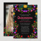 Vibrant and pretty Quinceanera Invitation for your daughter's 15th Birthday celebration. This Mexican Quinceañera theme features colourful Mexican folk art flowers in red, pink, purple and yellow on a black background. The photo template is set up to add a photo to the back of the card, which is decorated with a floral bouquet made from the same fiesta flowers. The template is set up ready for you to customise the card with all your personal details for your Mexican Fiesta Quinceanera party. Please browse our store for matching and coordinating items.