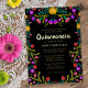 Colourful Floral Quinceanera Invitation with Real Gold Foil and Mexican Fiesta Flowers in red purple pink yellow blue and green on black.