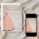 This quinceañera celebration/party invitation features a beautiful light pink dress on a beige background with a golden (non foil) frame.