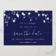 A girly and trendy Save the Date for a Quinceañera, 15th birthday party. A navy blue background decorated with silver stars. Personalise and add a date and name/age. The text: Save the Date is written with a large trendy hand lettered style script. The text is written with real silver foil. The stars on front are foil, on the back ordinary print.
