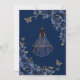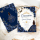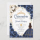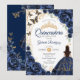 Navy, gold and white Quinceanera celebration invitation. Features brunette girl in ball gown dress, script font, gold butterflies, watercolor roses and tiara. Perfect for an elegant princess style glam celebration. Personalize with your own details. Printed Zazzle invitations or instant download digital printable template.