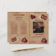 An elegant Quinceañera program with traditional Old English Red Roses, golden butterflies, a red mask and pearls.