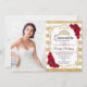 Quinceanera party invitation with your photo. Features stripes, script font, red roses, tiara and confetti. Classy white red design with faux glitter gold. Perfect for an elegant celebration.