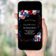 A chic black background. Decorated with patriotic coloured balloons in red blue and white. Personalise and add a name and party details. The name is written with a hand lettered style script.