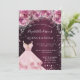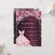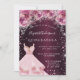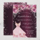 A modern, stylish and glamourous invitation for a Quinceañera, 15th birthday party. A burgundy faux metallic looking background with pink faux glitter dust, a dress and pink florals. The name is written with a modern hand lettered style script. Personalise and add your party details.