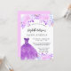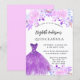 A modern, stylish and glamourous invitation for a Quinceañera, 15th birthday party. A white background with blush pink flowers, a purple ball gown. The name is written with a modern hand lettered style script. Personalise and add your party details.