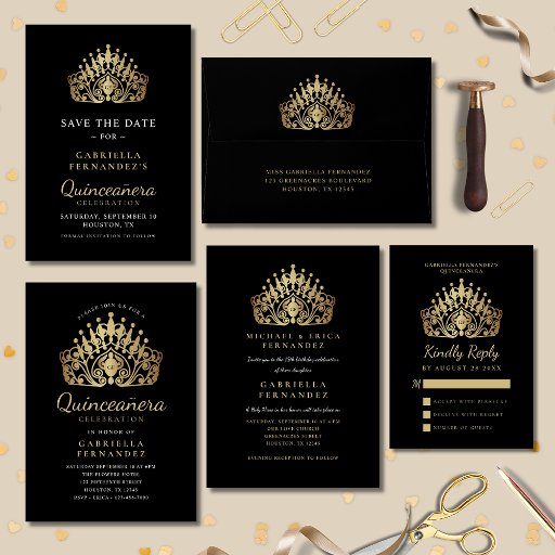 Quinceanera Princess Tiara Crown Black Gold Invitation