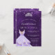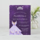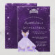 A modern, stylish and glamourous invitation for a Quinceañera, 15th birthday party. A deep purple background with faux glitter dust, a tiara and a dress. The purple colour is uneven. The name is written with a modern hand lettered style script. Personalise and add your party details.