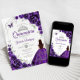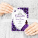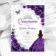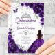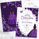 Purple, silver and white Quinceanera celebration invitation. Features, brunette girl in ball gown dress, script font, butterflies, watercolor roses and tiara. Perfect for an elegant princess style glam celebration. Personalise with your own details. Printed Zazzle invitations or instant download digital printable template.