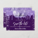 A dark purplebackground decorated with violet, lavender coloured faux glitter and balloons. Personalise and add a date and name/age. The text: Save the Date is written with a large trendy hand lettered style script.