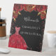 A welcome sign for a Quinceañera, 15th birthday party. A black background with faux glitter dust, a red dress and red roses, florals. Personalise and add a name.