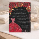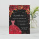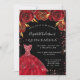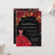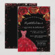 A modern, stylish and glamorous invitation for a Quinceañera, 15th birthday party. A black background with red faux glitter dust, a dress and red roses, florals. The name is written with a modern hand lettered style script. Personalize and add your party details.