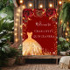 A welcome poster for a Quinceañera, 15th birthday party. A red background with faux gold glitter dust, a dress and red roses, florals. Personalise and add a name.