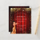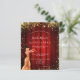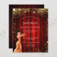 A modern, stylish and glamourous invitation for a Quinceañera, 15th birthday party, Hollywood theme. A red background with faux gold glitter dust, a girl wearing a golden dress. A red movie curtain as background The name is written with a modern hand lettered style script. Personalise and add your party details.