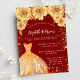 A modern, stylish and glamourous invitation for a Quinceañera, 15th birthday party. A red background with faux gold glitter dust, a dress and golden roses, flowers. The name is written with a modern hand lettered style script. Personalise and add your party details.