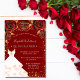 A modern, stylish and glamourous invitation for a Quinceañera, 15th birthday party. A red background with faux gold glitter dust, a white dress and red roses, florals. The name is written with a modern hand lettered style script. Personalise and add your party details.