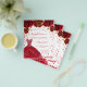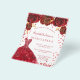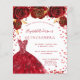 A modern, stylish and glamourous invitation for a Quinceañera, 15th birthday party. A white background with sparkles, a red dress and red roses, florals. The name is written with a modern hand lettered style script. Personalise and add your party details.