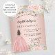 A modern, stylish and glamourous invitation for a Quinceañera, 15th birthday party. A rose gold background with blush pink flowers, a girl wearing a ball gown. The name is written with a modern hand lettered style script. Personalise and add your party details.