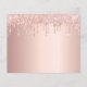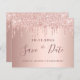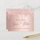 A girly and trendy Save the Date card for a Quinceañera, 15th birthday party. A rose gold faux metallic looking background decorated with faux rose gold glitter drips. Templates for a date and name and text. Dark rose gold coloured letters. The text: Save the Date is written with a large trendy hand lettered style script.